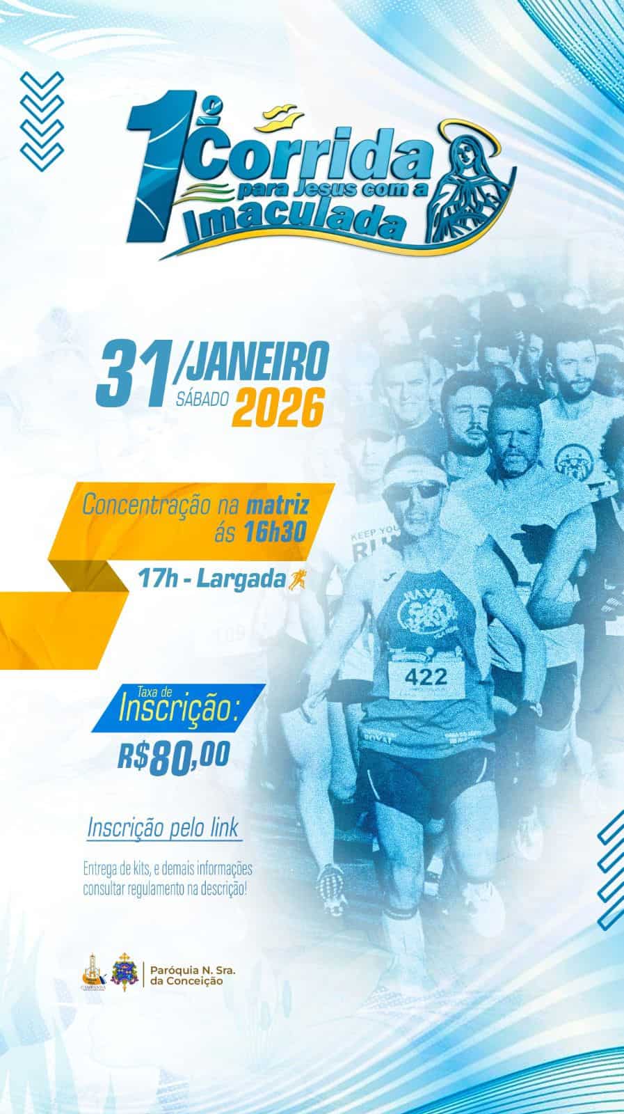 A corrida para Jesus com a Imaculada será realizada no dia 31/01/2026, sábado, no município de Pacajus, com largada e chegada na igreja matriz, com a participação de pessoas ambos sexos devidamente inscritos no evento.
