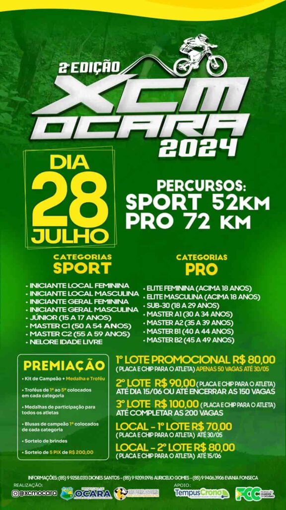O XCM OCARA MTB 2023 é uma competição de mountain bike estilo XCM a ser realizada na cidade de Ocara/CE no dia 30/07/2023 com início às 07:00h na cidade de Ocara na localidade de Vila São Marcos, precisamente no campo da Vila São Marcos. Poderão participar da competição todo e qualquer cidadão brasileiro ou estrangeiro. […]