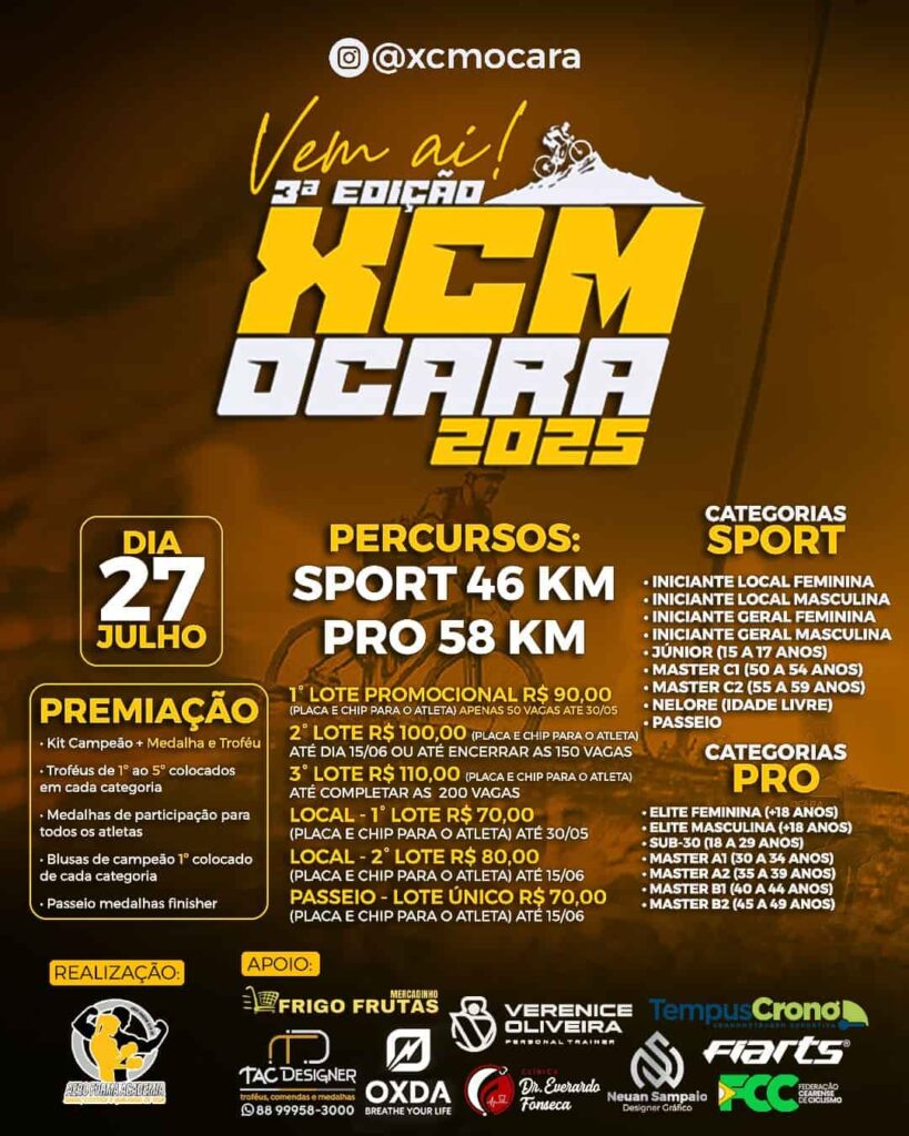 Vem aí a 2ª Edição do XCM OCARA 2024, a maior competição de MTB do Maciço de Baturité, que será realizado na cidade de Ocara/CE no dia 28/07/2024 com início às 07:00h na localidade de Vila São Marcos. Não fique de fora, venha, traga toda sua equipe para se desafiar, vivenciar muita adrenalina e superar […]